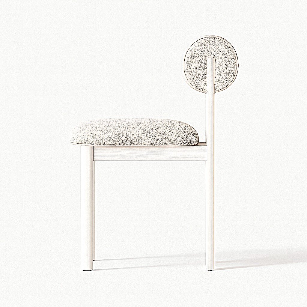 Η συγκεκριμένη καρέκλα με bouclé επένδυση σε off-white απόχρωση και λευκό ξύλινο σκελετό ξεχωρίζει για τον αρχιτεκτονικό, σύγχρονο σχεδιασμό της. Διαθέτει κυλινδρική πλάτη (roll backrest) και άνετο, επενδεδυμένο κάθισμα, προσφέροντας υψηλό επίπεδο άνεσης και μοναδική αισθητική.Ο μίνιμαλ χαρακτήρας και η all-white παλέτα την καθιστούν ιδανική για luxury weddings, modern dinners και curated event set-ups, όπου η λεπτομέρεια και η καθαρή γραμμή παίζουν πρωταγωνιστικό ρόλο.