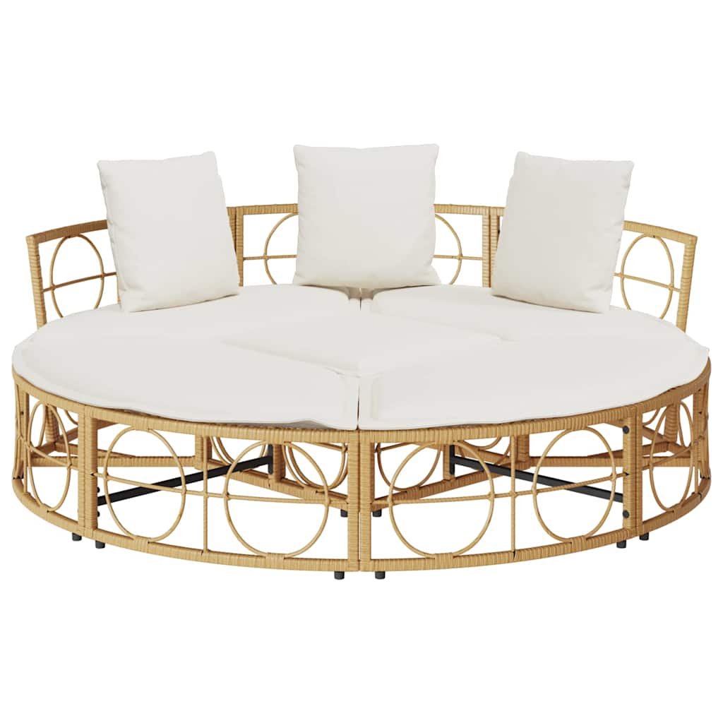 Αυτό το πολυμορφικό sofa-bed ρατάν είναι η ιδανική επιλογή για καλοκαιρινές lounge γωνιές και premium outdoor events. Ο κομψός κυκλικός σχεδιασμός του επιτρέπει να διαμορφώνεται είτε ως άνετος καναπές με τραπεζάκι, είτε ως πλήρες στρογγυλό κρεβάτι ημέρας.Υλικό: Συνθετικό ρατάν υψηλής ποιότητας σε φυσική απόχρωσηΜαξιλάρια: Ύφασμα off-white, αφαιρούμενα και άνετα για πολύωρη χρήσηΔιαμόρφωση: Το σετ αποτελείται από 5 τεμάχια που ενώνονται ή διαχωρίζονται εύκολαΙδανικό για: Παραθαλάσσιες εκδηλώσεις, ξενοδοχεία, pool parties, luxury outdoor lounges Με τη δυνατότητα να μετατραπεί σε circular daybed ή σε ανεξάρτητες θέσεις με τραπεζάκι, προσφέρει απόλυτη ευελιξία σε κάθε setup.