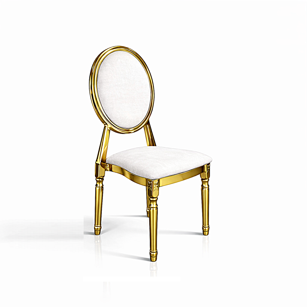 Η καρέκλα αυτή έχει σχεδιαστεί για επαγγελματική χρήση σε πολυτελείς εκδηλώσεις, συνδυάζοντας κλασική φόρμα με luxury αισθητική. Διαθέτει οβάλ επενδεδυμένη πλάτη και κάθισμα σε off-white απόχρωση, καθώς και μεταλλικό σκελετό σε χρυσό φινίρισμα, προσδίδοντας elegant και formal χαρακτήρα στο χώρο. Χρησιμοποιείται κυρίως ως καρέκλα δείπνου σε luxury weddings, αλλά και ως statement seating επιλογή σε gala dinners, formal receptions και high-end corporate events, όπου απαιτείται αίσθηση πολυτέλειας και αρχοντικής κομψότητας.