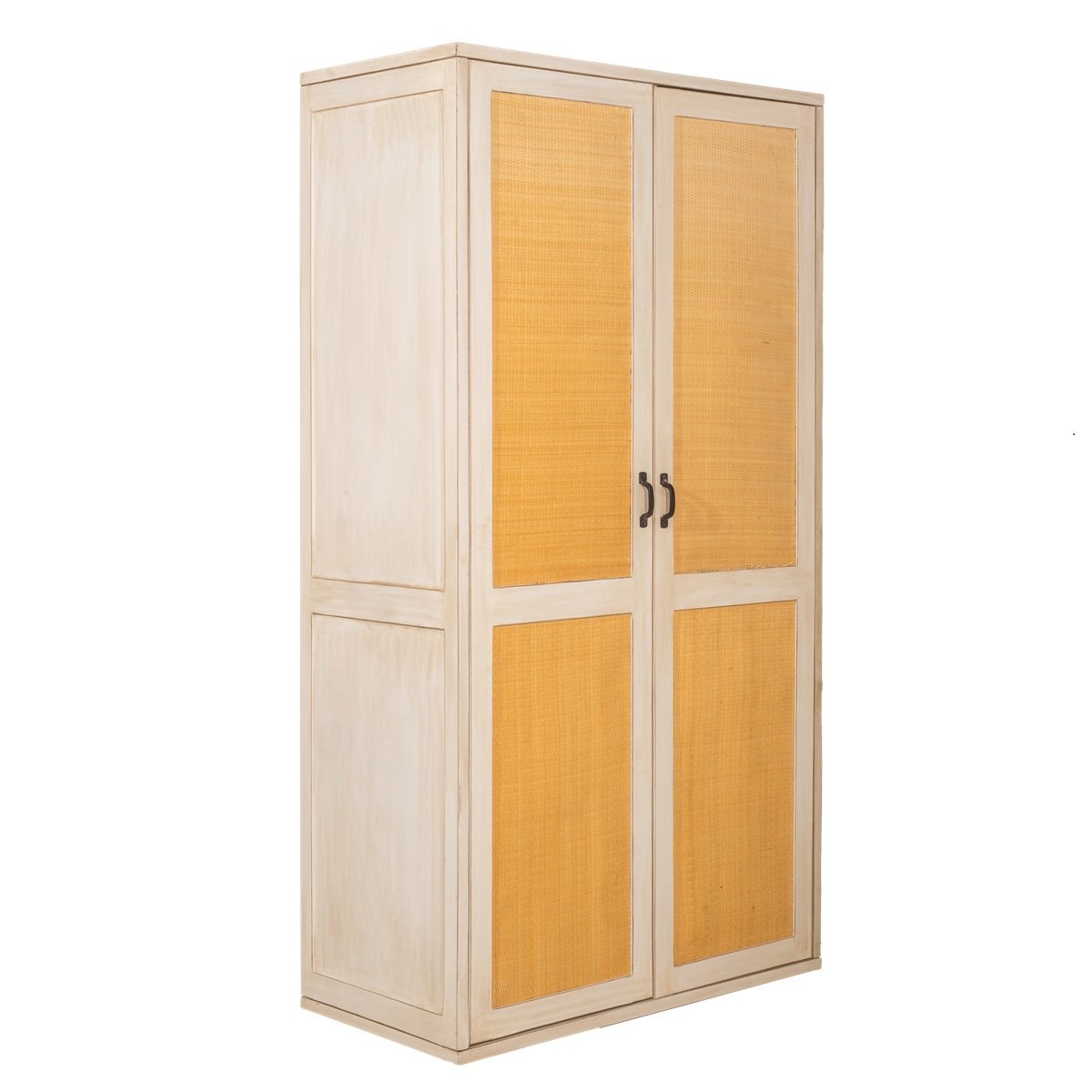 Μια statement ντουλάπα με boho-chic αισθητική, κατασκευασμένη από μασίφ οξιά με τελείωμα σε λευκό ντεκαπέ και πόρτες επενδυμένες με φυσική ψάθα. Ένας κομψός συνδυασμός παραδοσιακής χειροτεχνίας και μοντέρνου σχεδιασμού, ιδανικός για χώρους με φυσική ή ethnic διακόσμηση.