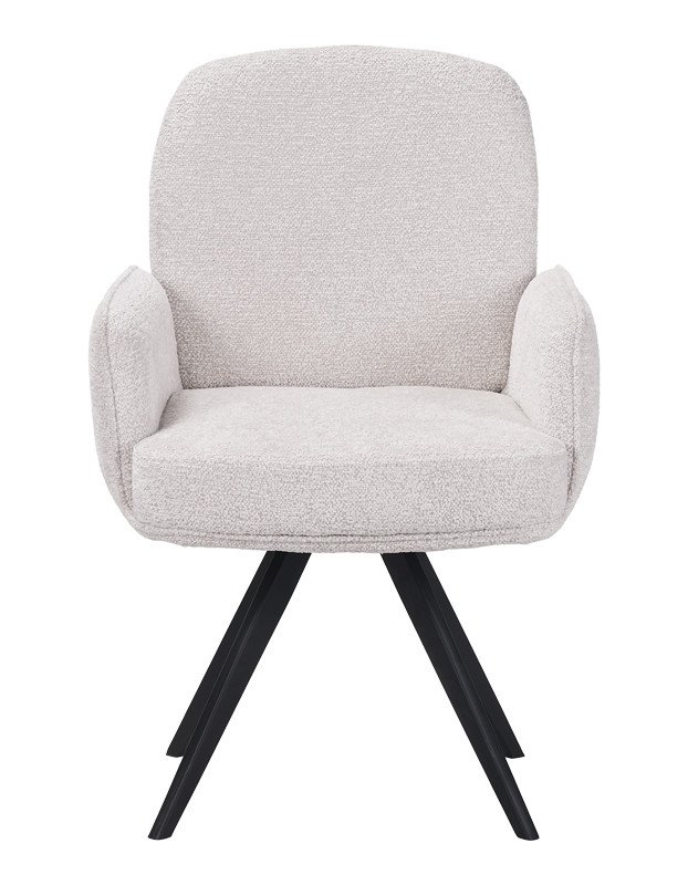 Κομψή πολυθρόνα με ταπετσαρία, με απαλό λευκό ύφασμα bouclé σε ουδέτερο τόνο, σε συνδυασμό με μοντέρνα μαύρη μεταλλική βάση.