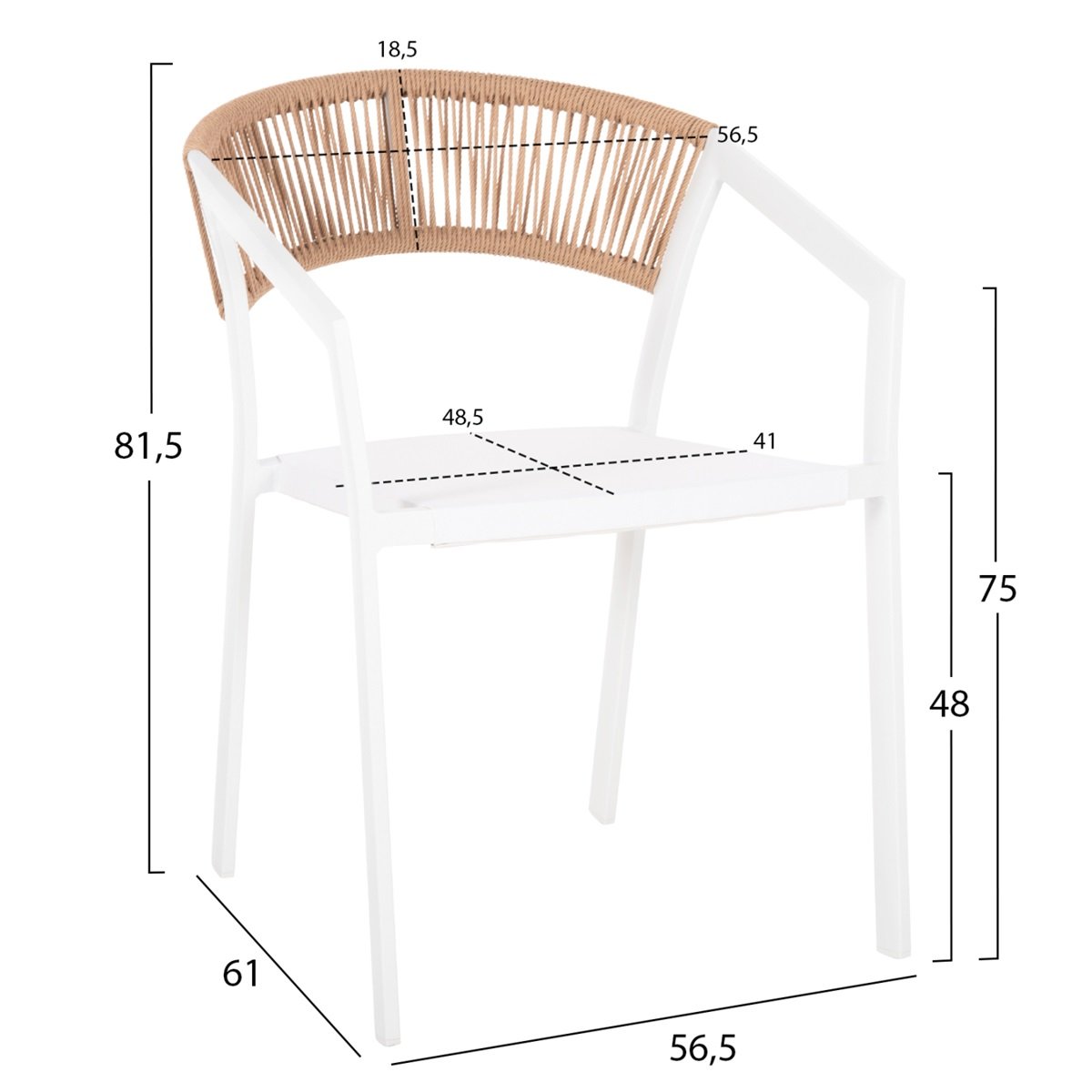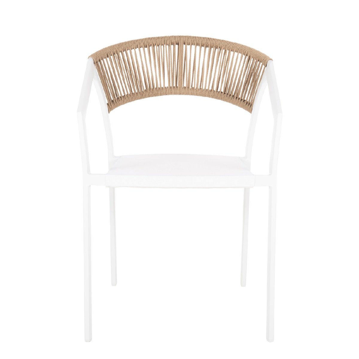 Καρέκλα εξωτερικού χώρου με λευκό σκελετό και πλεκτή πλάτη από φυσικό σχοινί. Ελαφριά, ανθεκτική και κομψή, κατάλληλη για weddings, corporate events, dining set-ups και outdoor hospitality χώρους.