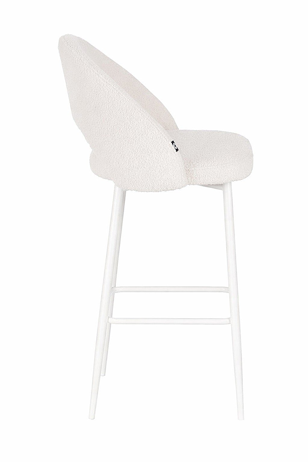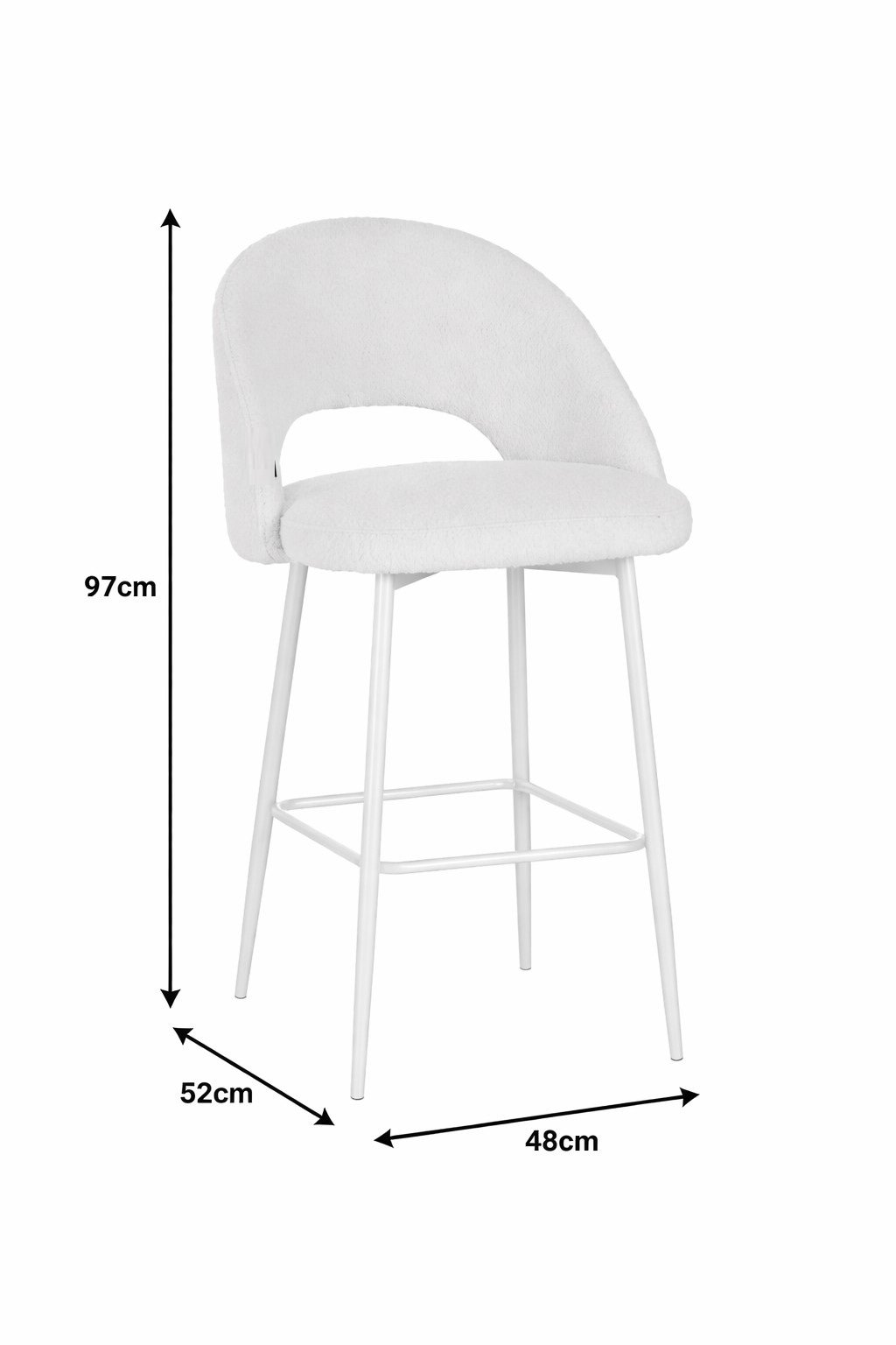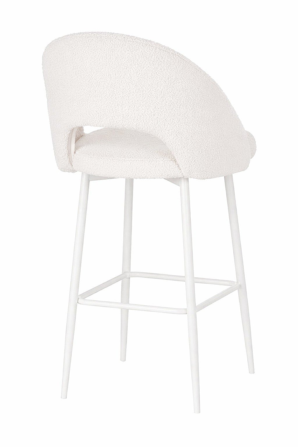 Κομψό και σύγχρονο bar stool με επένδυση από απαλό bouclé ύφασμα σε λευκή απόχρωση και λευκή μεταλλική βάση, ιδανικό για elegant bar set-ups, wedding receptions και premium corporate events.