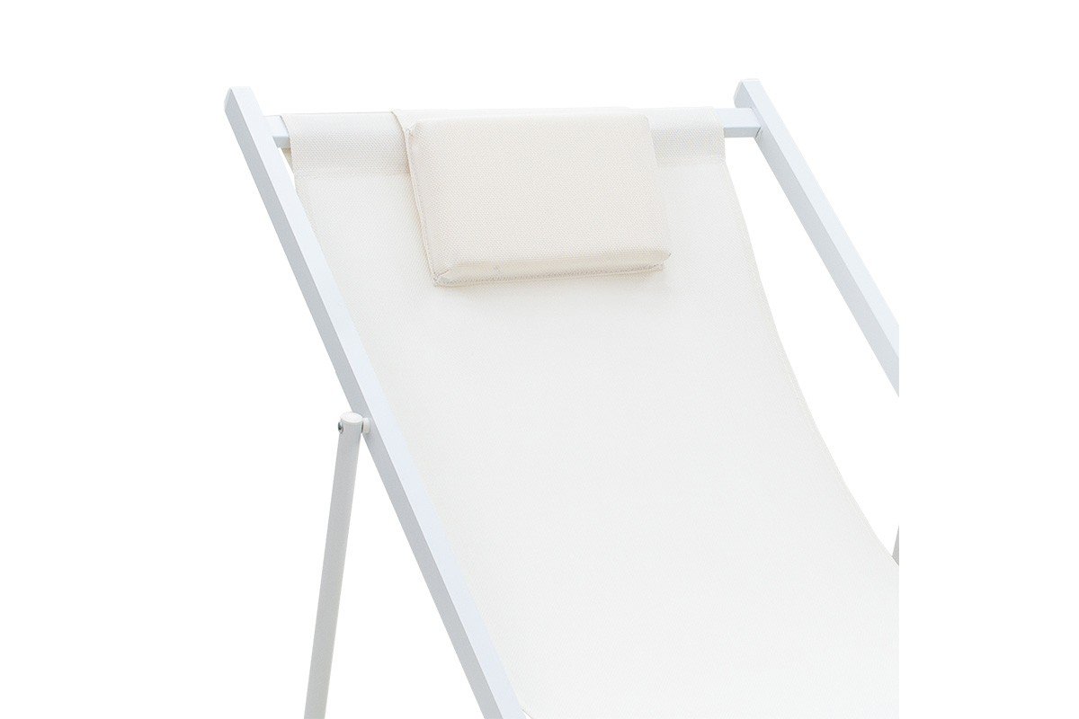 Σεζλόνγκ εξωτερικού χώρου με μεταλλικό σκελετό και υφασμάτινη επιφάνεια σε ανοιχτή απόχρωση. Ελαφριά, αναδιπλούμενη και λειτουργική, κατάλληλη για beach events, pool areas, lounge set-ups και outdoor hospitality χώρους.