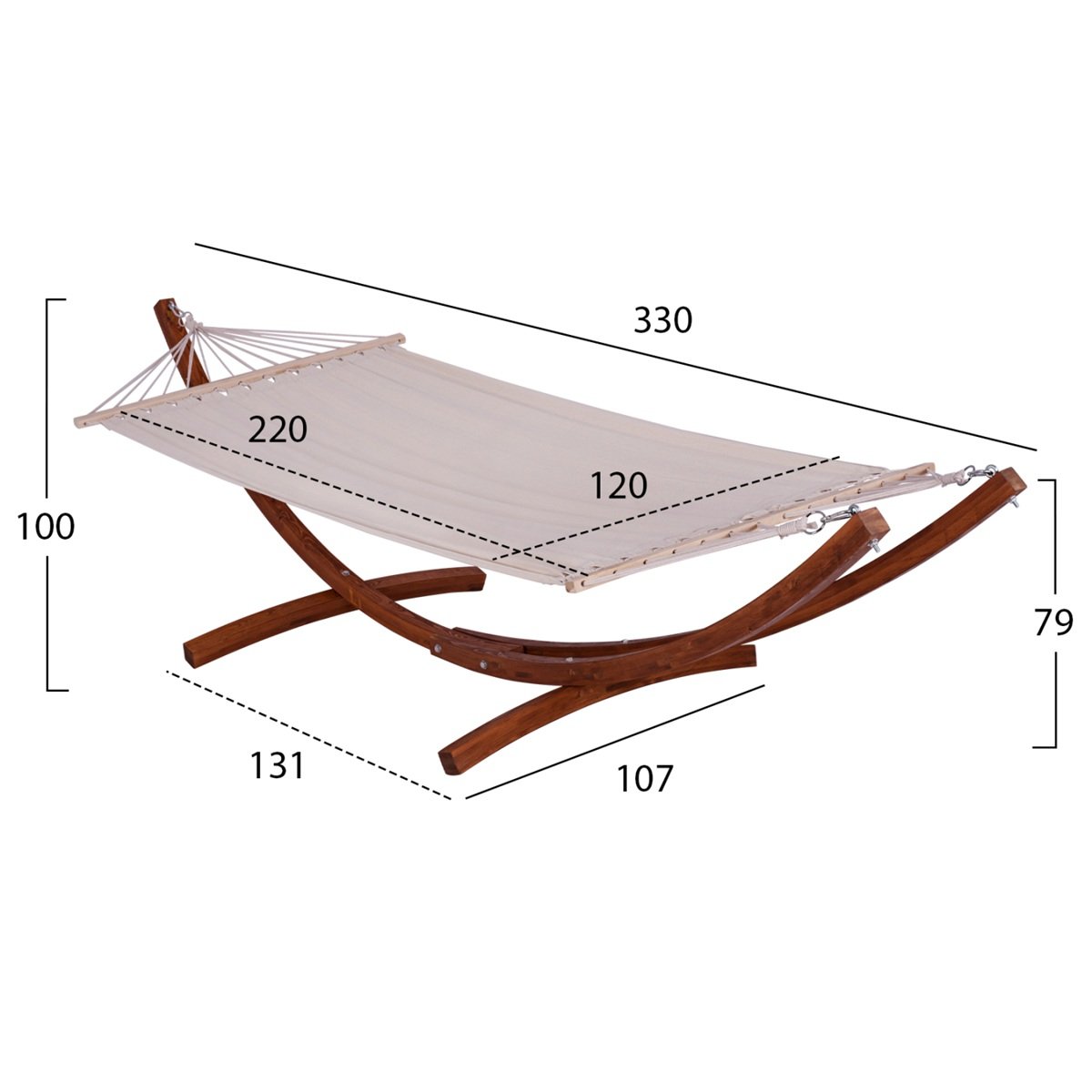 Ξύλινη αιώρα εξωτερικού χώρου με ανθεκτικό σκελετό και υφασμάτινη επιφάνεια σε ουδέτερη απόχρωση. Προσφέρει άνεση και χαλάρωση, κατάλληλη για beach events, lounge set-ups, resorts και outdoor hospitality χώρους.