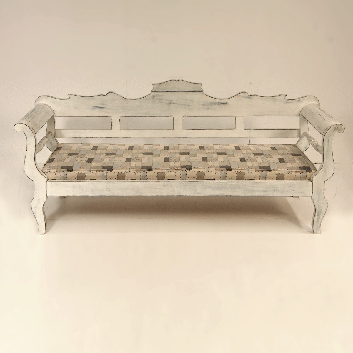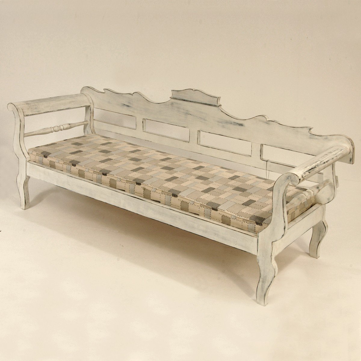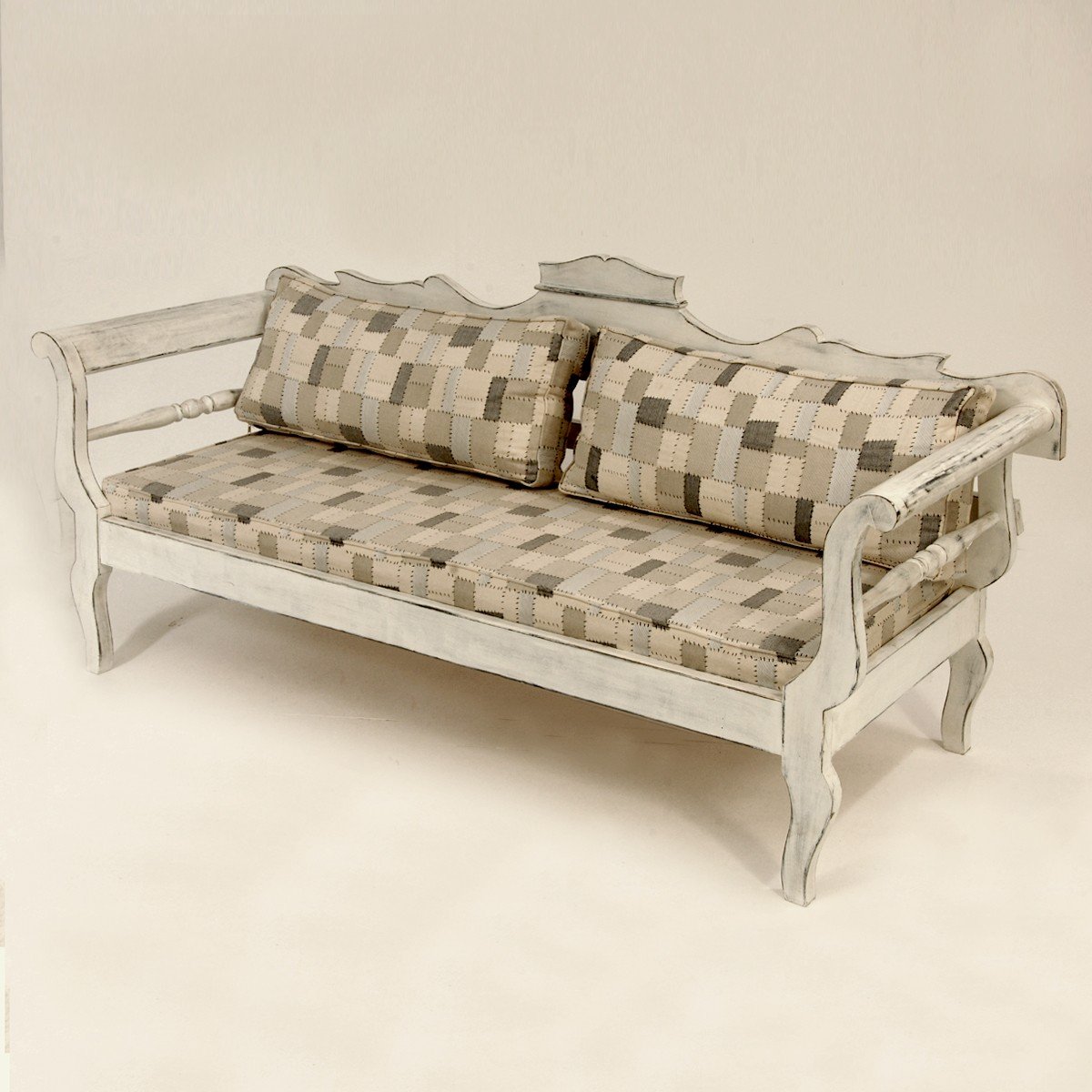 Καναπές νησιώτικου στυλ, κατασκευασμένος από μασίφ ξύλο οξιάς. Τα χρώματα του επίπλου είναι πατίνα διπλού ντεκαπέ με επεξεργασία παλαίωσης .