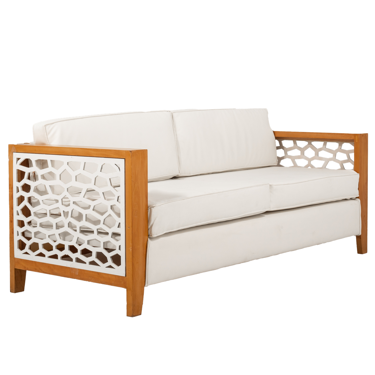 Κομψός ίσιος καναπές με ξύλινα μπράτσα και διαχρονικό design, ιδανικός για lounge set-ups, weddings, corporate events και premium χώρους φιλοξενίας..