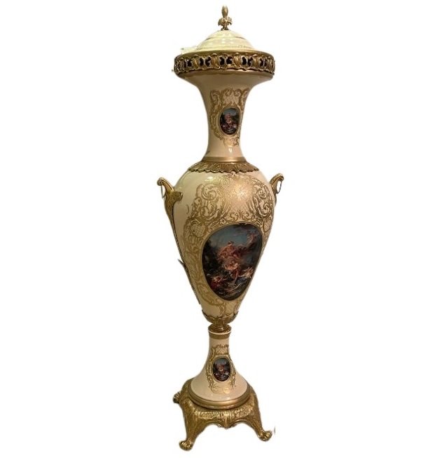 Διακοσμητικό βάζο τύπου Sevres με κλασική και επιβλητική αισθητική, ιδανικό για την ανάδειξη πολυτελών και αριστοκρατικών set-ups σε εσωτερικούς χώρους και εκδηλώσεις. Οι ανάγλυφες λεπτομέρειες και ο διαχρονικός σχεδιασμός του προσδίδουν αίσθηση κομψότητας και ιστορικού χαρακτήρα, καθιστώντας το κατάλληλο για ξενοδοχεία, δεξιώσεις, επαγγελματικούς χώρους, φωτογραφικά σκηνικά και θεματική διακόσμηση υψηλής αισθητικής.